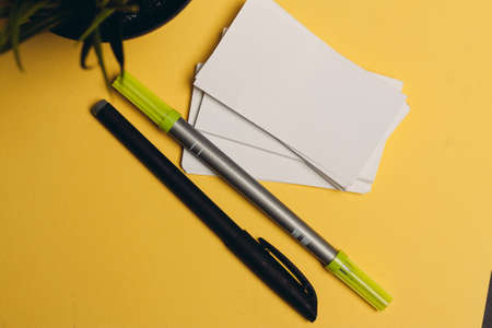 markers pens and rubber bands on a yellow background flowers in a pot and a cup of coffee