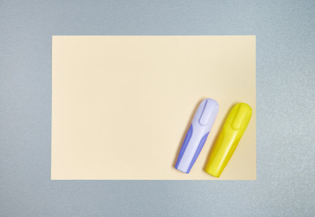 Yellow and purple marker pens on a yellow sheet of paper on a gray backround . Flat lay. Top view