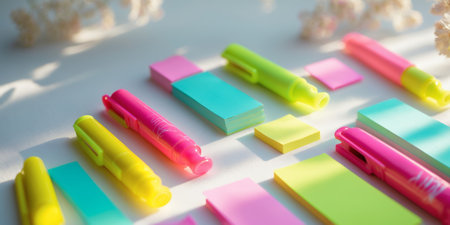 A visually appealing arrangement of colorful markers and sticky notes on a wooden desk, set in a bright office, perfect for inspiring creativity and effective organization during work or study sessions.