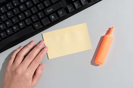 Businesswoman Presenting Note With Important Message On Office Desk With Marker. Woman Showing Crutial Information On Paper. Executive Displaying Critical Data.