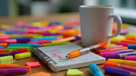 A vibrant scene featuring a coffee cup next to a notepad, surrounded by colorful highlighters and markers, creating an inviting workspace atmosphere.