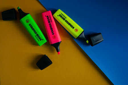 Sumbawa, Indonesia - June 16, 2022: Colorful text highlighter trademark Stabilo Boss on Blue and orange background paper. pen highlight office tools equipment