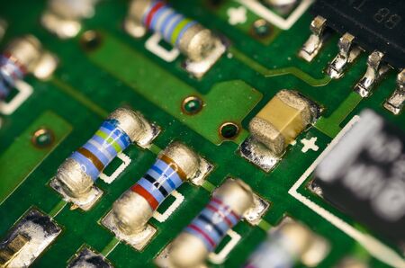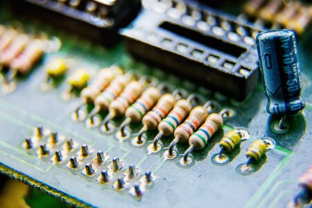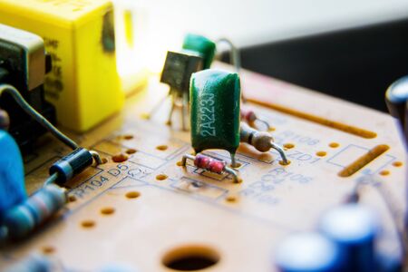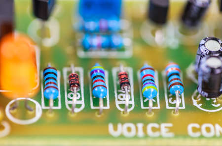 Closeup electronic hardware . Resistor and condensers assembly on the circuit board