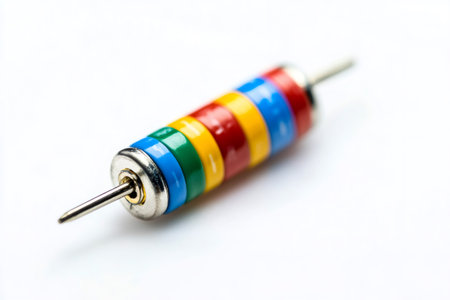 Macro close up of a colorful electronic resistor with metal pins, isolated on a white background, representing electronic components and electrical engineering