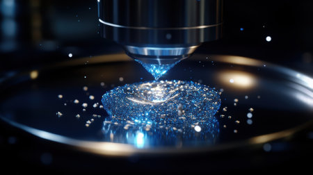Liquid is precisely applied onto a metal surface by a high-tech machine, showing an advanced manufacturing process in a dimly lit workshop.