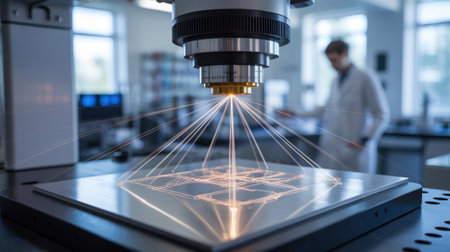 Innovative laser engraving machine etching intricate design on metal plate in high tech laboratory