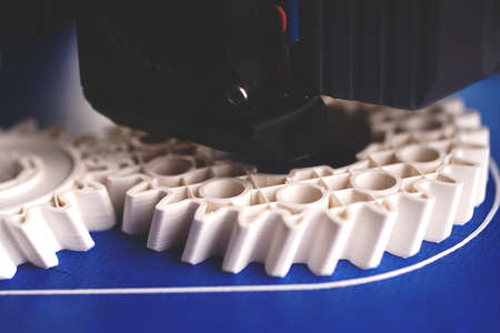 close up on production process of two helical gears by a 3D printer. visible layers. white plastic filament on blue taped build platform. Misty style with selective focus. additive manufacturing concept