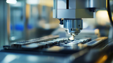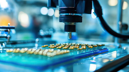 A modern robotic device delicately places tiny circuits onto a circuit board, conveying precision and high-tech innovation in manufacturing.