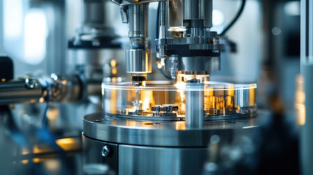 Precision manufacturing machine processing a silicon wafer, creating microchips and electronic components in a high tech cleanroom laboratory environment