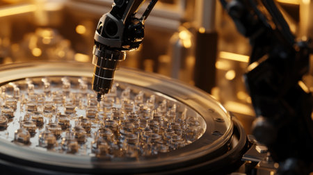A medium closeup of an intricate robotic arm carefully dispensing microvolumes of a viscous protein solution into a series of small wells showcasing precision engineering and the advance