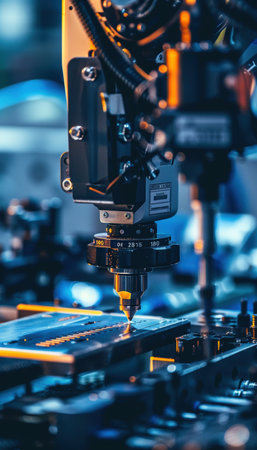 An intricate close-up of advanced industrial machinery showcasing precision tools and technology in a manufacturing environment, highlighting innovation and detail.