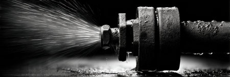 The powerful flow of water erupts from a tightly sealed valve, illustrating immense dynamics pressure in a stark monochrome contrast.