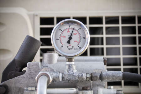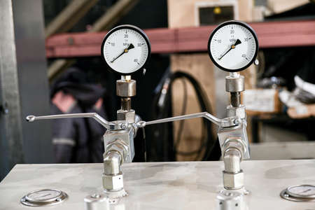 Pressure gauge Meter installed, Measuring Tool equipment close up in a car repair shop. Valve and other parts in the background are out of focus.