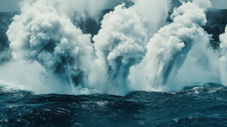 Experience the breathtaking beauty of powerful ocean waves exploding into stunning water geysers, creating dramatic clouds and frothy sprays against a deep blue sea.