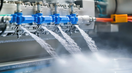 This image showcases precision water spray nozzles delivering fluid in an industrial setting, highlighting high-pressure operation and steam conditions.