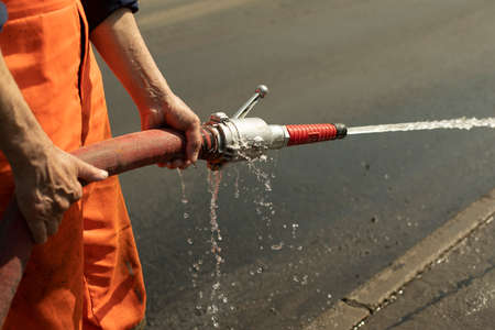 A worker washes the road with a hydrant. Hose with water jet. Washing away dirt from the road.