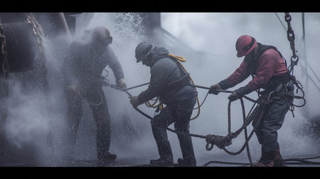 Three male workers help each other pull sling in the midst of bad weather.