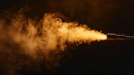Dramatic image of smoke plume emerging from nozzle, creating intense and captivating visual effect. swirling orange and yellow hues evoke sense of energy and movement, enhancing overall atmosphere