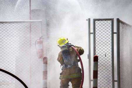 Firemen in a fire-fighting training exercise