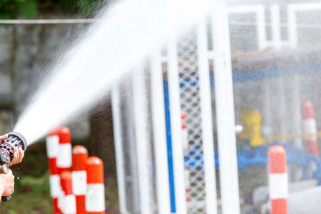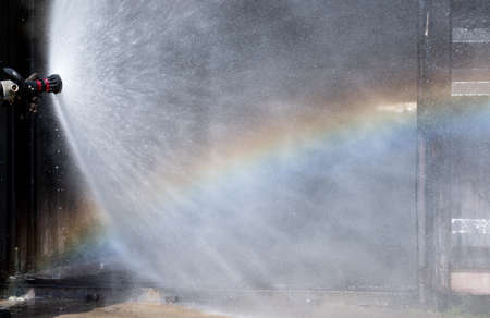 Close up water curtain from sprinkler of fire station with reflection of rainbow in front of area of fire occur.