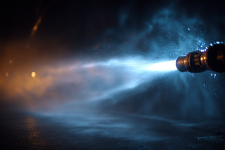 A high-pressure spray nozzle is prominently featured in a workshop setting, with water droplets capturing light to create a misty atmosphere, highlighting industrial processes.