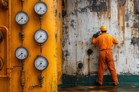 A marine engineer in an orange uniform inspects machinery in the engine room of a vessel, surrounded by industrial gauges and equipment.
