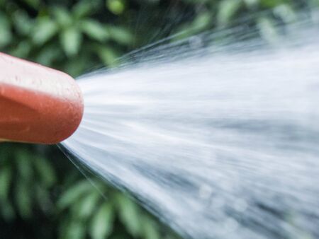 Water hose. The flow of water from the pipe. A man holds a fire hose.
