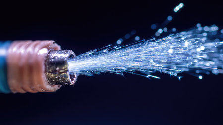 Close-up of a severed cable with blue sparks in the darkness, showcasing the energy and potential hazard of electricity
