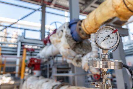 Pressure gauge in oil and gas production process for monitor condition, The gauge for measure in industry job, Industry background and close up gauge.