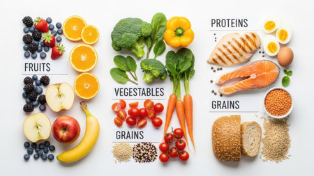 An overhead view displays a collection of diverse food groups. Fruits, vegetables, proteins, and grains are neatly arranged. The image showcases various colors and textures, suggesting a balanced and nutritious diet. Suitable for use in health, wellness, and educational materials.