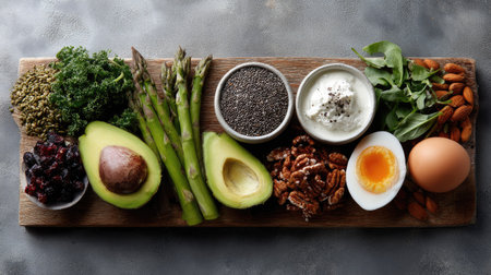 A visually appealing arrangement of fresh ingredients on a wooden board, showcasing avocado, asparagus, kale, nuts, and an egg, perfect for healthy meals.