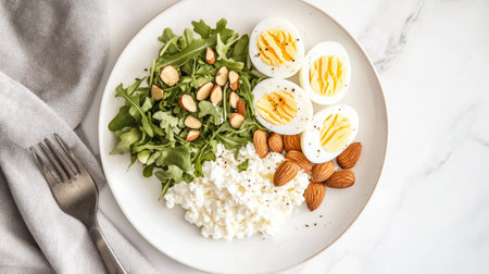 Plate of boiled eggs, cottage cheese, and almonds with arugula. High-protein meal for keto diets