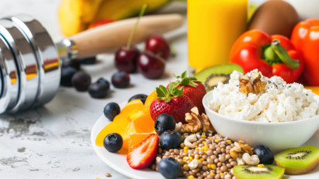 Healthy lifestyle and nutrition eating concept. Food with sports fitness equipment