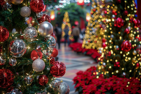 Festive mall bustling with Christmas shoppers and seasonal holiday decor.