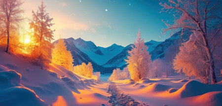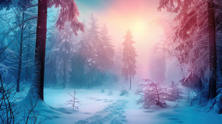 This serene winter landscape features a snowy forest illuminated by soft colors, creating a magical atmosphere ideal for peaceful escapes and nature lovers.