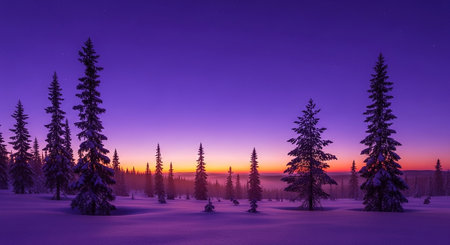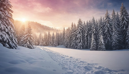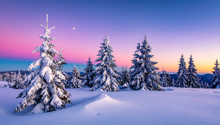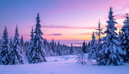 A breathtaking winter scene featuring tall evergreen trees blanketed in fresh snow beneath a soft pink and purple sky, evoking a serene and tranquil atmosphere.