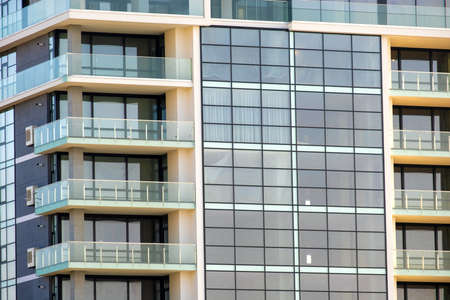 Architectural details of modern high apartment building facade with many windows and balconies