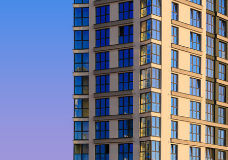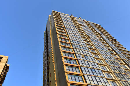Horizontal shot of the new high-rise house on blue sky background. View from the bottom up