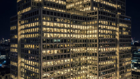 Modern office building windows lit in evening night early morning long working hours exhaustion overtime exterior urban architecture skyscraper lights tower financial sector banking hq headquarters
