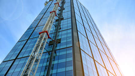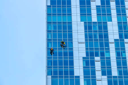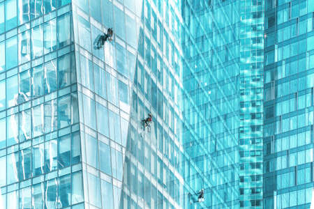 Window washers cleaning the glass facade of a modern building, high risk work