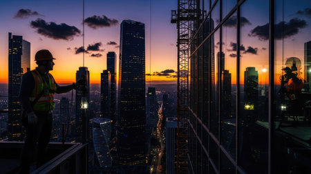 Silhouette of construction worker working on top of building with cityscape background.