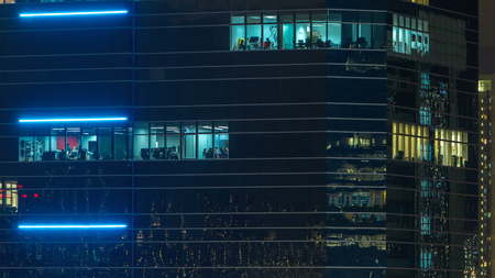 Windows with light in modern city office building at night timelapse. View from top. 4K