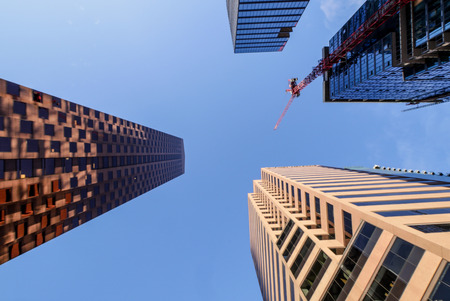 Bottom view of modern skyscrapers in business district against blue sky. Looking up at business buildings in downtown.