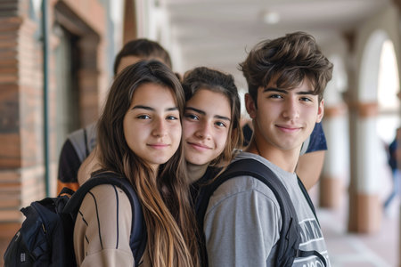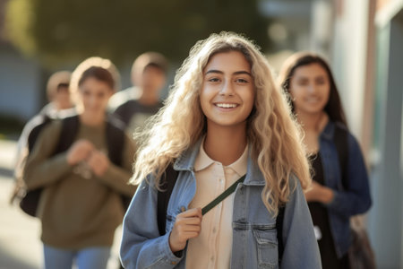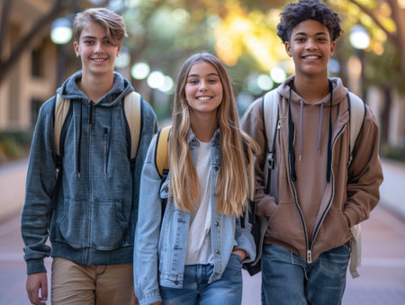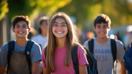 teen Students walking to school together, looking to camera. ai generated