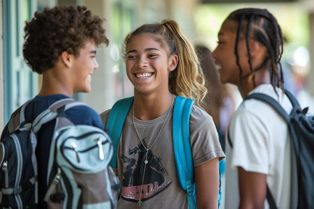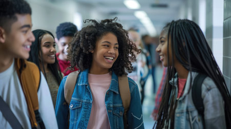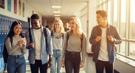 Friends in school corridor. Teenage classmates have fun in school. Created with Generative AI