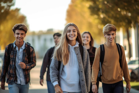 Happy teenager students walking to school together. AI Generative