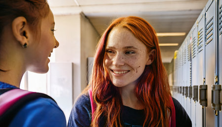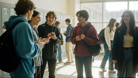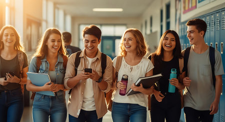 A diverse group of five high school students walks and talks together in a school hallway, lined with lockers. They are smiling and laughing, carrying backpacks, suggesting friendship and a positive school environment. The central girl is laughing heartily.