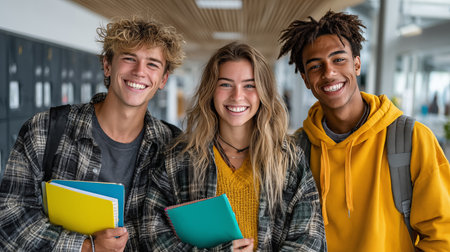 Portrait of a group of students standing in a corridor at school, Portrait of happy young students, AI Generated
