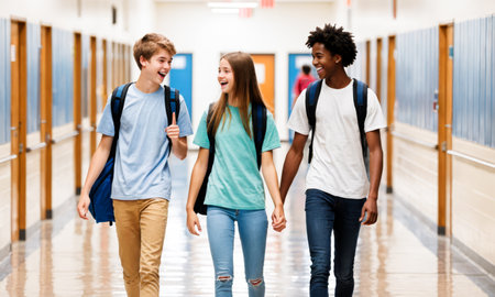 A group of high school students, including two girls and a boy, walk down a hallway lined with lockers. They are laughing and talking, seemingly enjoying their time together during the school day.