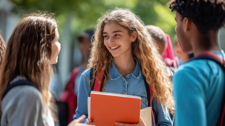 A vibrant scene showcasing a group of happy students engaging in conversation outdoors, highlighting friendship and youthful energy in a school setting.